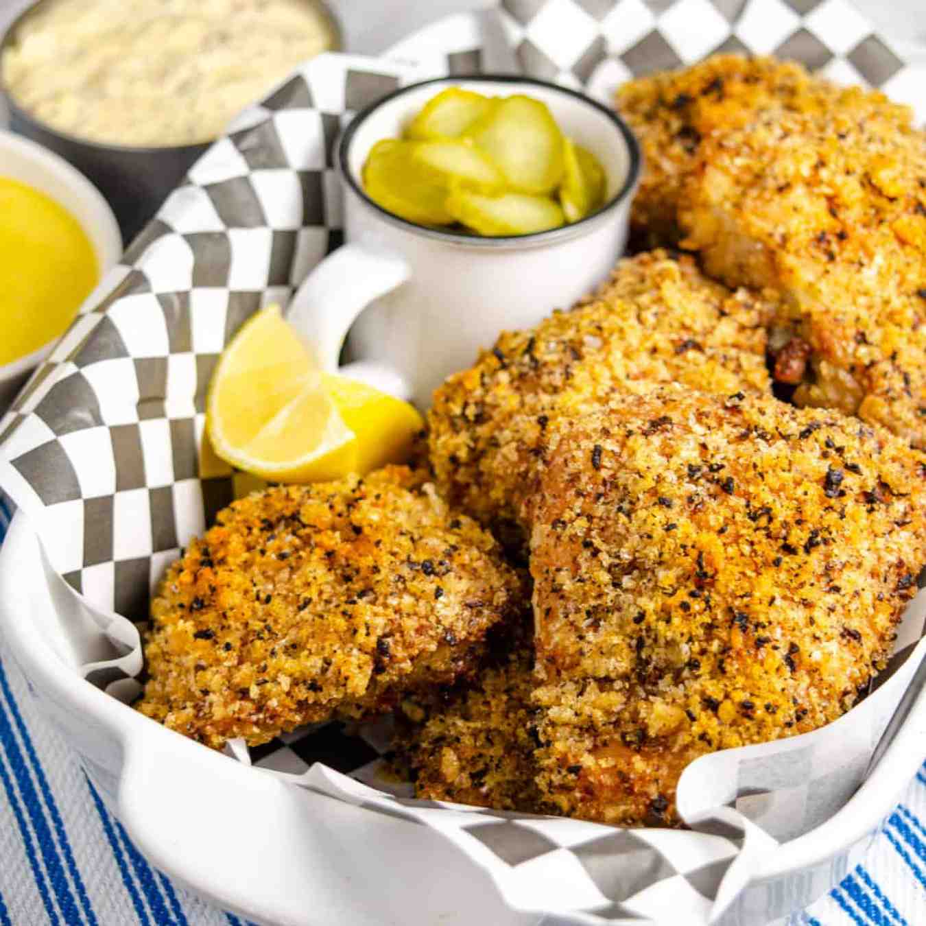Làm nóng chảo với dầu ở nhiệt độ vừa, cho miếng gà vào, chiên chín vàng đều mỗi mặt trong 3 phút rồi để trên khăn giấy, để ráo dầu rồi dọn ra đĩa
