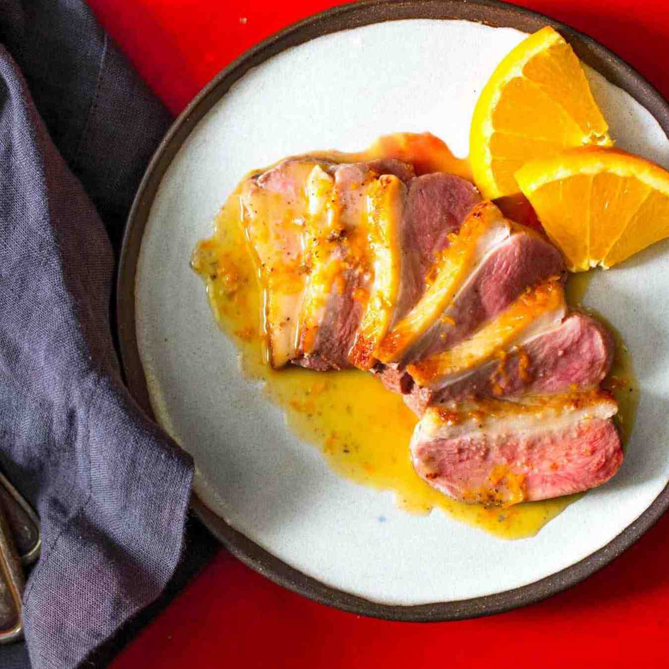 Rưới nước sốt cam lên ức vịt, trộn đều và áp chảo tiếp trong vài phút