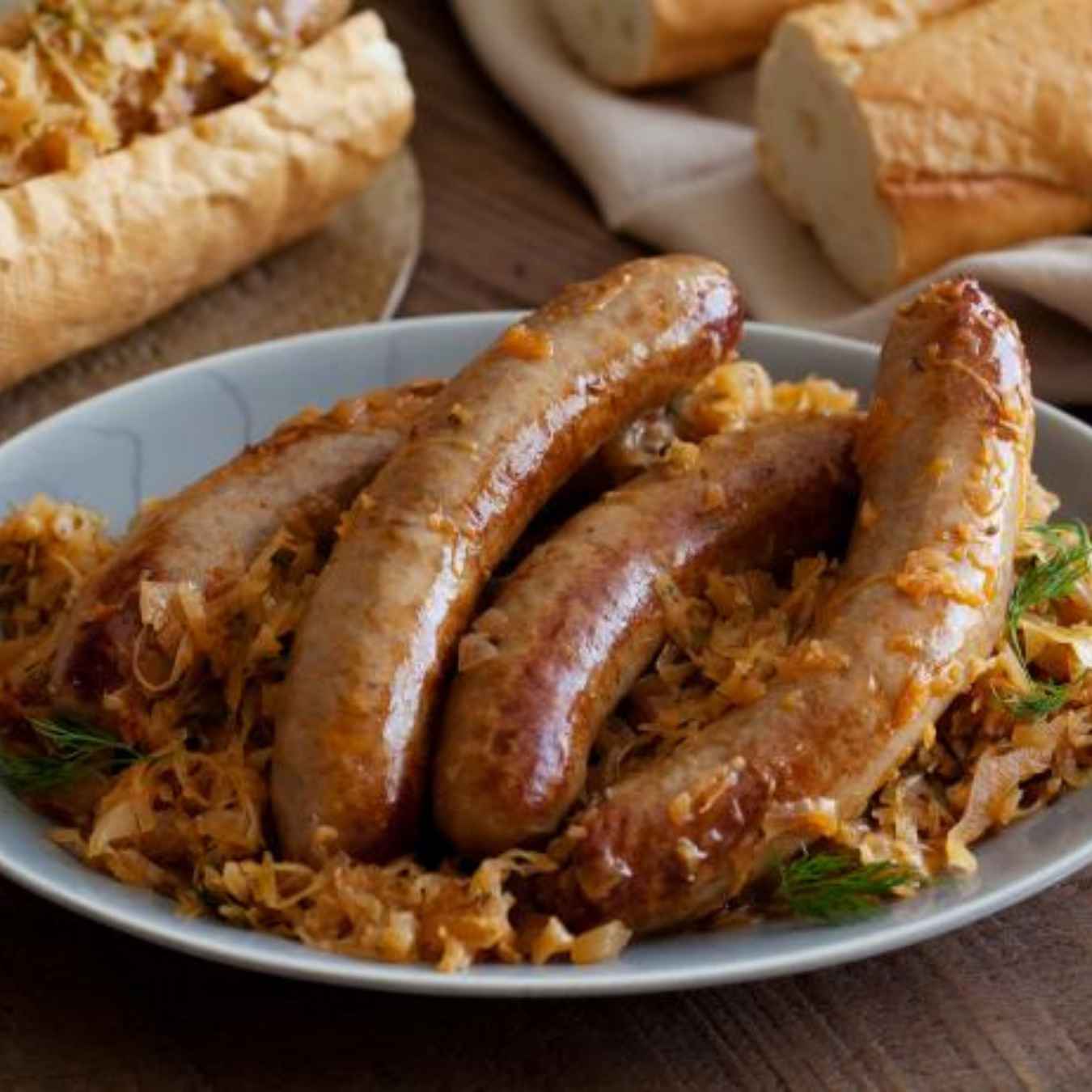 Đặt xúc xích và hành tây lên đĩa sau đó cho dưa cải Sauerkraut vào chảo và đảo trong 3 phút