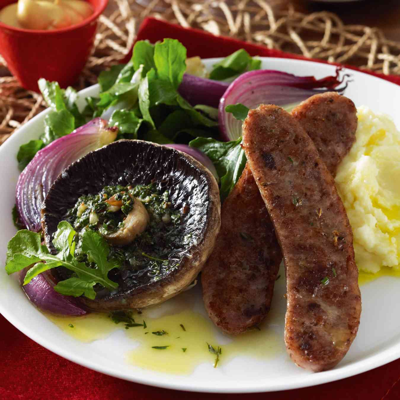 Dùng khay nướng, trộn các lát xúc xích với dầu, muối, hạt tiêu, ớt chuông, nấm, hành tây và đảo đều