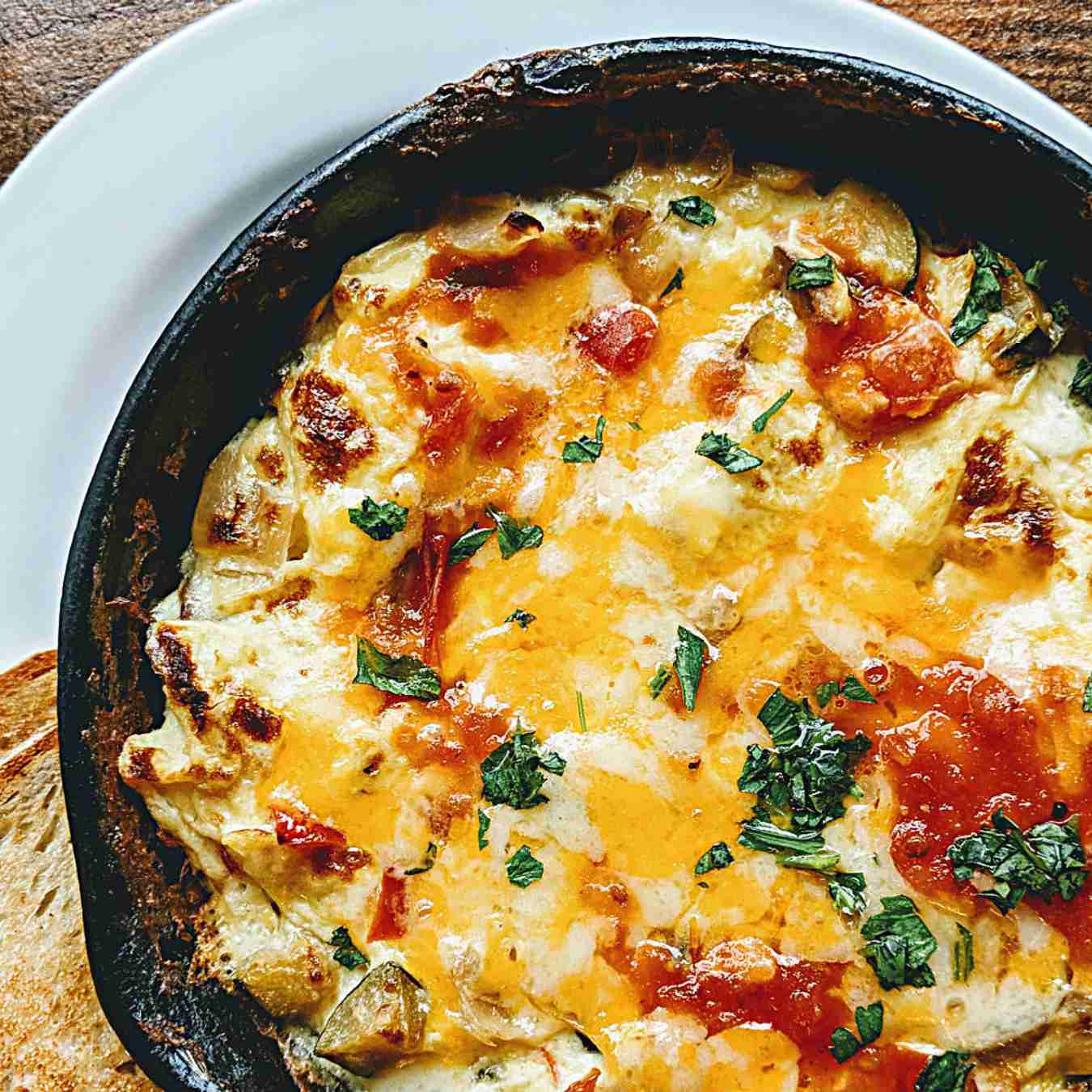 Dàn đều hỗn hợp xúc xích xuống phần dưới đáy chảo. Đập trứng vào, chú ý cẩn thận để không làm vỡ lòng đỏ. Vặn nhỏ lửa, sau đó rắc phô mai lên trên rồi đậy nắp chảo lại. Để hỗn hợp chín thêm trong vòng 5 phút (sao cho lòng trắng trứng chín nhưng lòng đỏ vẫn còn lòng đào). Tiếp tục đậy nắp vung lại và chờ thêm khoảng 1-2 phút nếu cảm thấy cần thiết