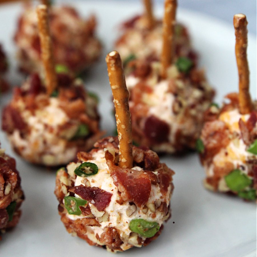 Lăn từng viên qua miếng giăm bông hun khói thái nhỏ rồi bày lên đĩa và thưởng thức